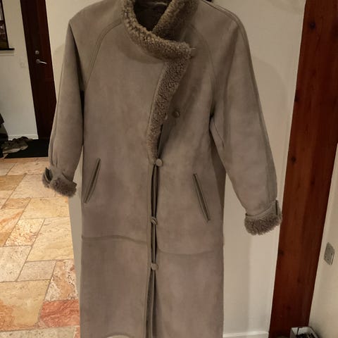Rulamspelsjakke med præget metallic overflade. Jakken har rævekrave og ræv ved håndled, figursyet, lukkes med 3 knapper, påsatte lommer og flæsekante i kroppen i ruskind. Helt unik jakke. Llngde fra skulder 69 cm, ærmellngde 66 cm, bryst ca. 96 cm, hofte 104 cm.
