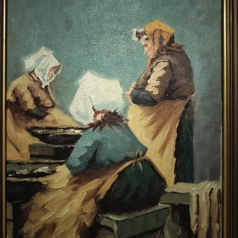 Chr. Mortensen maleri med motiv af fiskere ved havnen. Olie på lærred, indrammet i en dekorativ guldramme. Maleriet viser en gruppe fiskere i traditionelle klæder, siddende og stående på træplader ved vandet. Signeret af kunstneren Chr. M. Vestergaard.