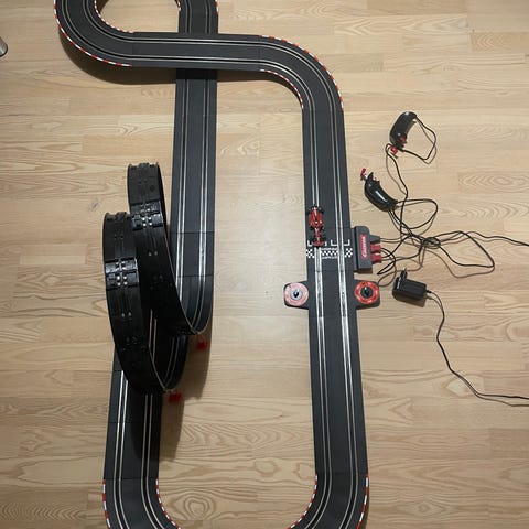 Der er 3 fungerende store gashåndtag og en del ekstra tilbehør og reservedele (slæbesko, dæk og ledninger). Der er 2 fungerende strømforsyninger, så man kan faktisk lave 2 separate baner.