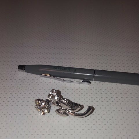 Broche, andet materiale, Sølvfarvet med store similisten 3 cm i diameter. Kan også bruges som vedhæng i halskæde. Sikkerhedslås. (392)