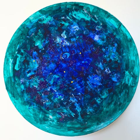 Stort unika keramikfad. Acrylmalet og sprayet med klar lak. Bredde ca. 40cm.