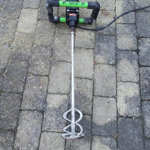 Rubimix-9 N røremaskine med rød farve. Maskinen er designet til blanding og omrøring af materialer og har en robust konstruktion til bygge- og konstruktionsbrug.