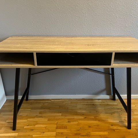Skrivebord med 2 hylder og 1 skuffe fra Jysk, ny pris 899,-