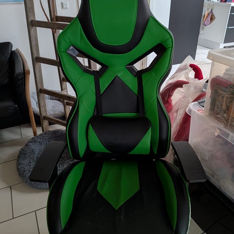 Lambjerg gaming stol med sort og grøn farvetema. Stolen har polstret sæde og rygstøtte med tilhørende nakkepude og lændepude. Justerbare armlæn og ergonomisk design til gaming og kontorbrug.