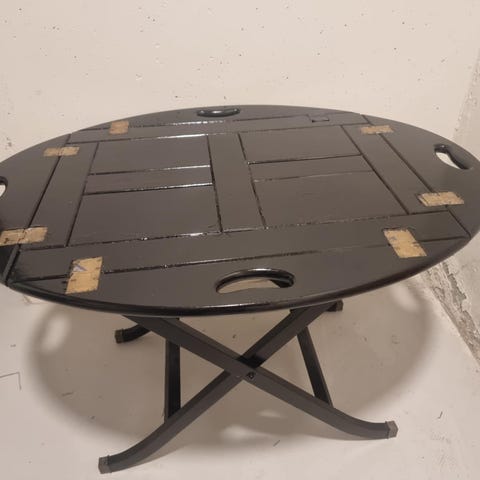 Smukt antikt serveringsbord/bakkebord i træ med aftagelig bakke og tilhørende stativ. Bakken har integrerede håndtag og kan nemt tages af og anvendes separat, hvilket gør bordet både praktisk og dekorativt.