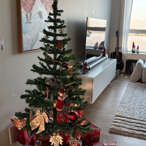 Højde 180 cm, kun brugt 1 gang, kan opbevares i medfølgende papæske. Kan bruges igen og igen, sælges da vi ikke skal holde jul mere. Med eller uden pynt. Pris uden pynt 200,-