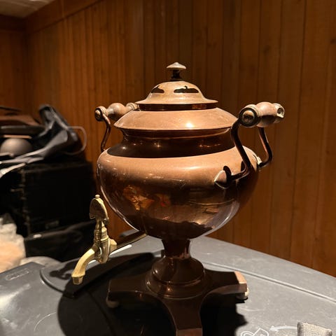 Imponerende antik samovar i massivt kobber med originale messingdetaljer og hane. Samovaren har været i familiens eje i mange år og er arvet, og den fremstår i meget flot stand med smuk, naturlig patina.