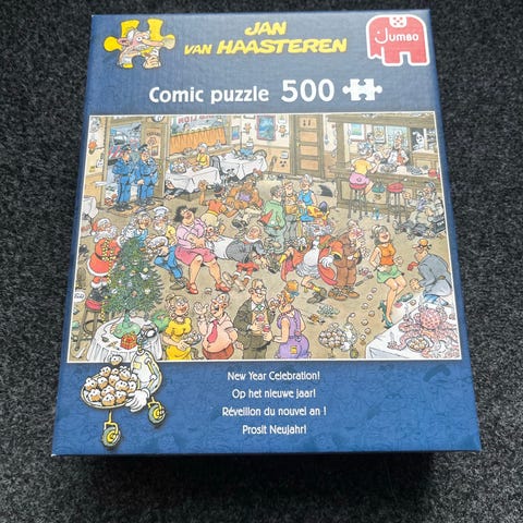Jumbo Jan van Haasteren Comic Puzzle med 500 brikker. Puslespillet har et detaljeret og humoristisk motiv, der forestiller en skiscene med forskellige karakterer og aktiviteter. Passer til voksne og børn, der kan lide udfordrende puslespil.