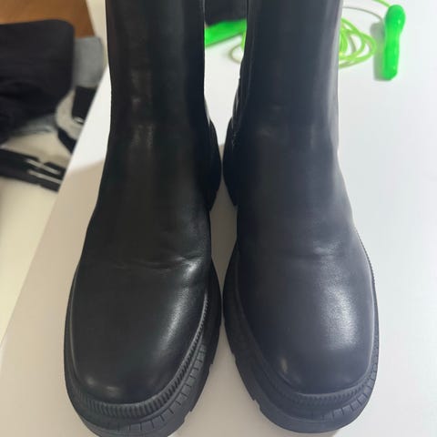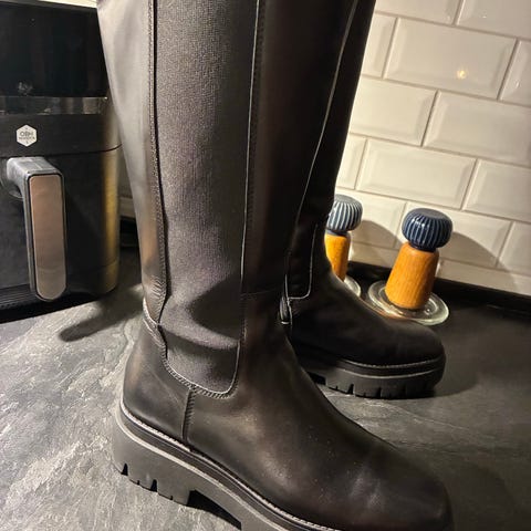 Tamaris støvler i størrelse 40 i sort farve. Støvlerne har snørebånd og lynlås på siden for nem påtagning. Materialet er læder eller lignende, med en robust sål og en dekorativ spænde på anklen. Velegnet til dagligt brug og udendørs aktiviteter.