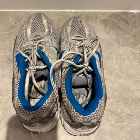 Sko i størrelse 43, farven hvid. Skoene er designet til løb og har en kombination af materialer, der sikrer komfort og støtte under aktivitet.