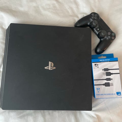 Slim spilkonsol i hvid farve. Konsollen er designet til gaming og underholdning med adgang til et bredt udvalg af spil. Den leveres med en sort DualShock 4 trådløs controller.