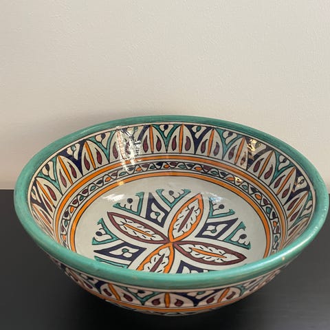 Smuk dyb skål i farverne i hvid, sort, blå, grøn, gul og turkis. Skålen er fra Marokko - produceret i byen Fes. Diameter 24 cm., højde 12,5 cm. Med huller til ophængning på væggen. Se også mine andre annoncer med marokkansk keramik - små og store skåle og fade.