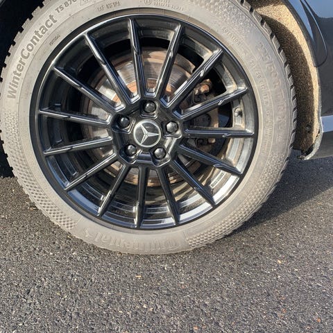 DVB 17 tommer søvfarvede alufælge med CEAT WinterDrive dæk. Monteret første gang i februar 2023. To dæk har 7 mm profildybde og to dæk har 5 mm profildybde. Fælgene fremstår pæne, men har lidt mærker og brugsspor, som man kan se, nu hvor de er nyvaskede.