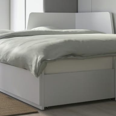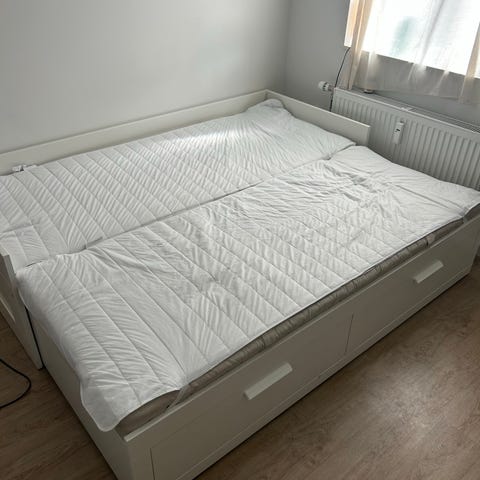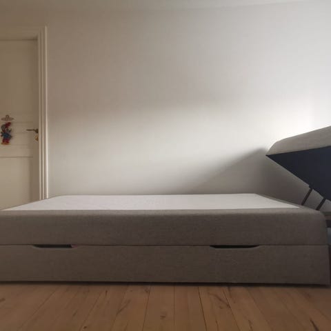 Sofa, IKEA, enkeltseng, dobbeltseng og opbevaring i ét! Perfekt, hvis du kun har lidt plads. Eksklusive madras, men tilgængelig til en moderat pris. For detaljer se: https://bit.ly/4scs6tf