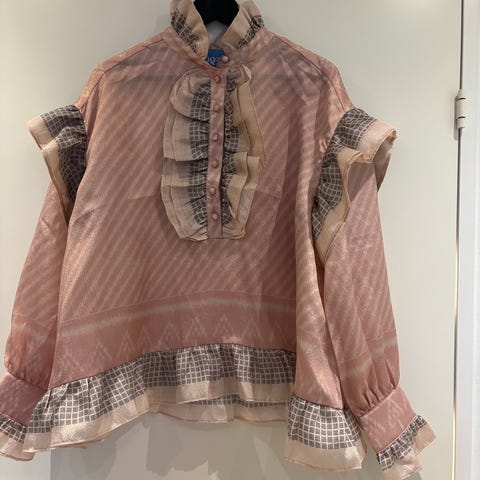 Joseph Ribkoff Bluse i sølvfarve, størrelse 44. Blusen har dekorative knapper og flæsedetaljer ved halsen. Brugt kun 1gang til festen..np 2200kr