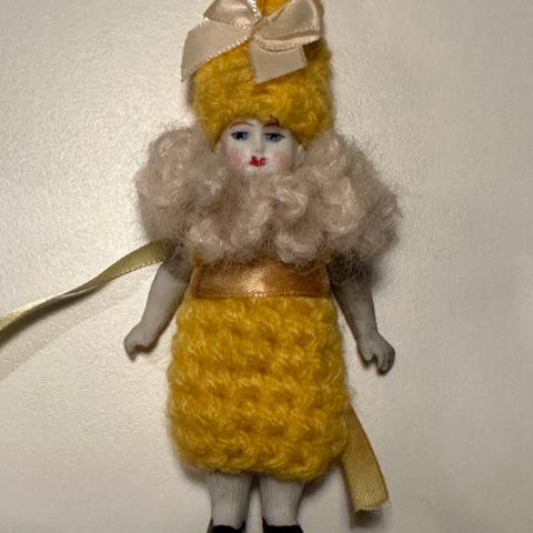 Fin håndskåret figur i træ med mange fine detaljer - f.eks. sko, der titter ud under kjolen og knapper i livstykket. Højde 15,5 cm. Har en vandskade nederst bag på kjolen (se billeder). Formentlig dansk, men alderen er ukendt.