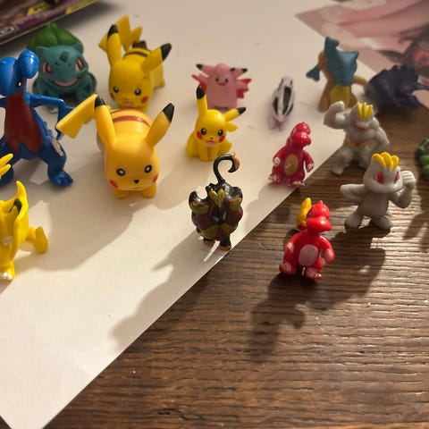 Samling af Pokémon figurer i forskellige størrelser og farver. Figurenes materialer og specifikke modeller varierer. Egnet til samlere og fans af Pokémon-serien.