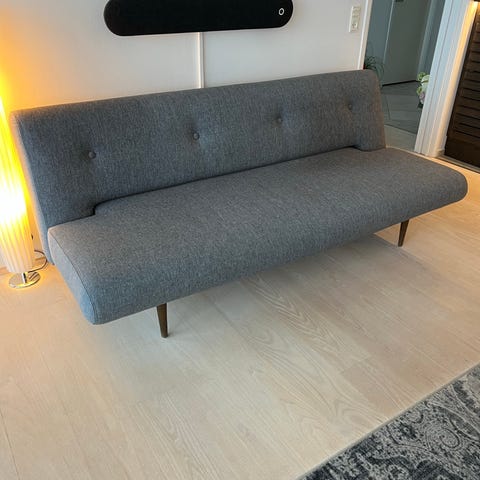 Elegant sovesofa og loungestol i eg og gråt stof (sælges som sæt)