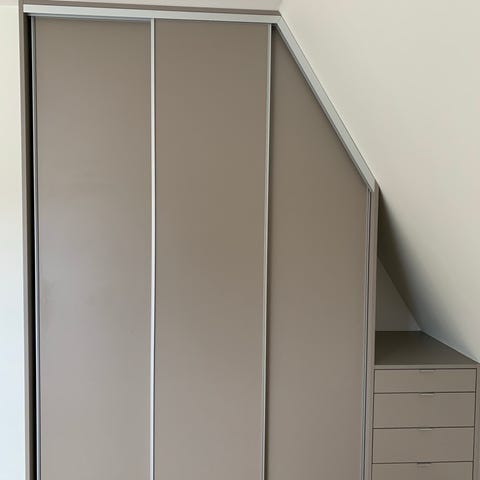 Sprint er en serie af garderobeskabe som findes i 3 størrelser. Sprint udmærker sig ved at være en serie af skabe i en god kvalitet, med kraftige sider, som holder til at blive brugt, og stadig sælges til gode priser. Skabene leveres komplet med indretning, og der kan tilkøbes ekstra hylder til det brede rum i skabet, sælges i pakker af 2 stk. Vi lagerfører skabene i alle 3 størrelser i hvid og grå kunstfiner. Dette Sprint skab er særligt velegnet til dig som har masser af tøj, men kun begrænset plads til et garderobeskab. Skabet her måler 196 cm i bredden, og indeholder 3 rum. To rum på 47 cm i bredden, begge indeholder 3 løse hylder. Rummet over skufferne måler 96 cm, og indeholder en bøjlestang. Skufferne skal placeres i midten af skabet som på billedet. Øverst i skabet har du en gennemgående hylde, som ikke kan flyttes. Skabet kan kombineres med de øvrige skabe i serien, hvis du har behov for mere skabsplads. • Grå kunstfiner • Komplet med indretning • 6 løse hylder, 1 gennemgående fast hylde, 3 skuffer og 1 bøjlestang • Ekstra hyler til det brede rum kan tilkøbes, pakke med 2 stk. varenr. 19504 • Mål i cm.: H.200 x B.196 x D.50 •