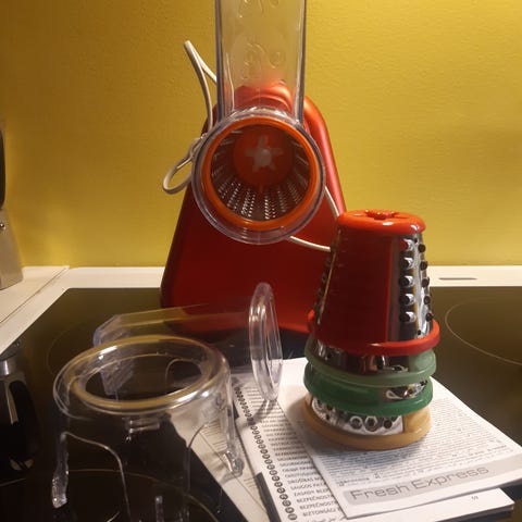 Tefal Fresh Express+ køkkenmaskine – komplet med fem rive- og skæreskiver.