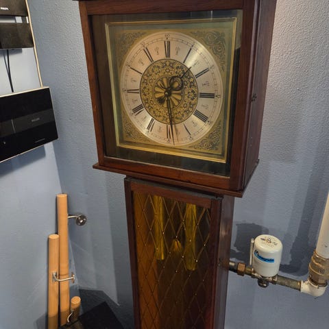 Gulvstående pendulur med rund urskive, grøn malet krop og dekorative gulddetaljer. Uret har en låge, der åbner til vægtmekanismen indvendigt. Designet til at stå på gulvet og fungere som både tidsmåler og dekorativt element. VIRKER FINT.
