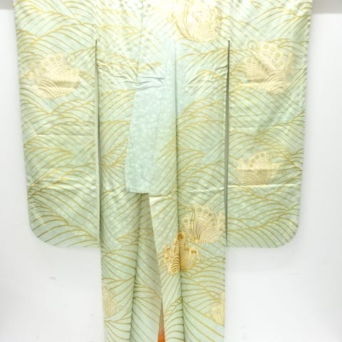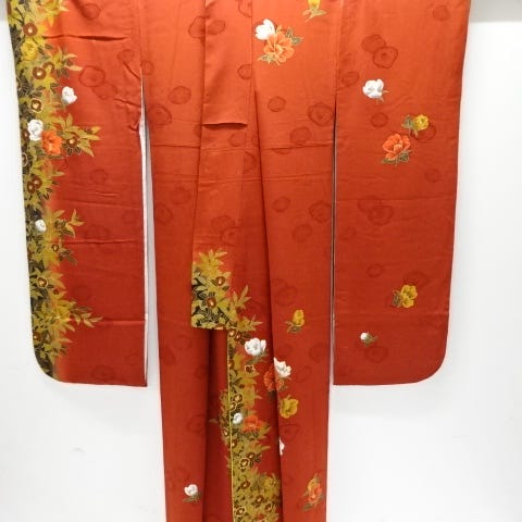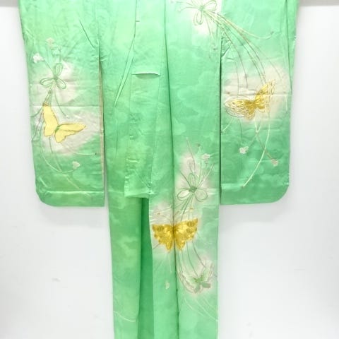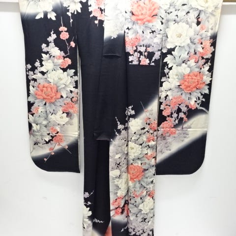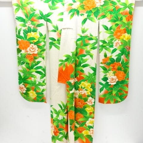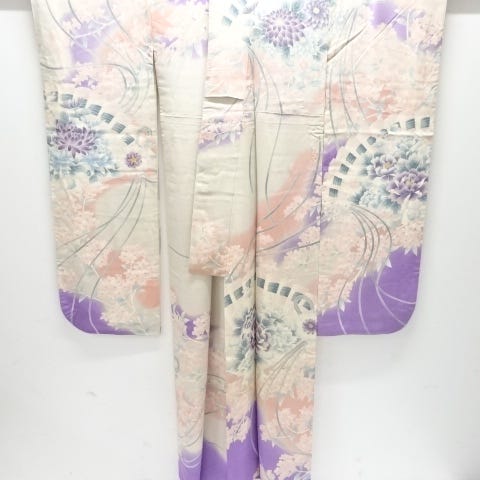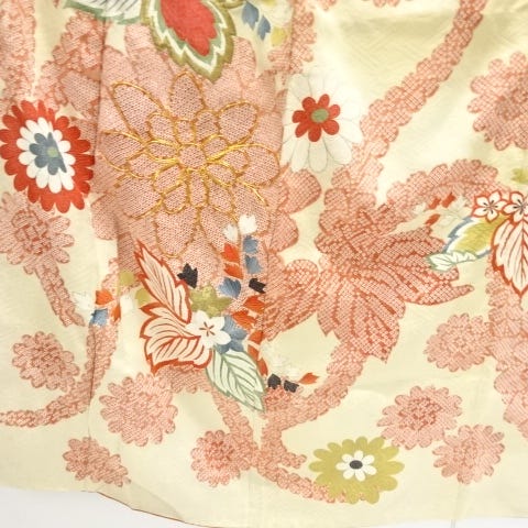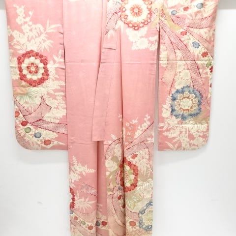 Vintage japansk Furisode Kimono, silke og broderi, vifte og krysantemum
