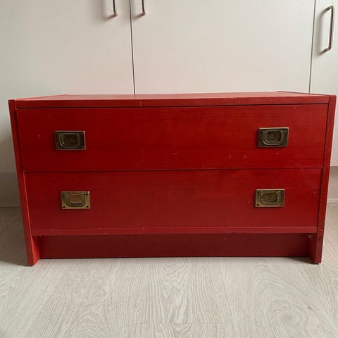 Meget sød kommode i rød og lyserød. God plads i skufferne.