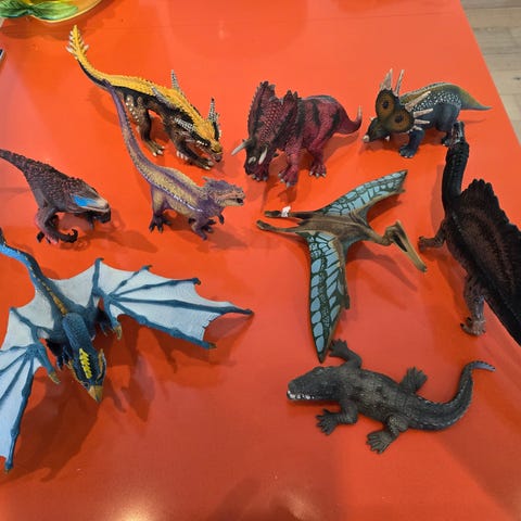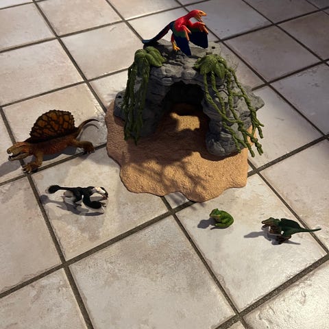 Schleich Dinosaur legetøjssæt indeholder tre mindre dinosaurfigurer samt et stort dinosaurkranium. Sættet er leget med men i en god stand.