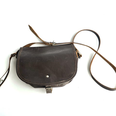 Håndlavet patrontaske fra ARTESANIA F. Exposito ægte Læder skuldertaske i mørkebrun farve med justerbar rem. Tasken har en frontklap med spænde og syninger i kontrastfarve. Designet til unisex brug.