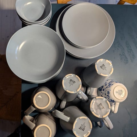 9 stk. store firkantet tallerkener, 6 stk. middagstallerkener, 8 stk. dybe tallerkener, 9 stk. frokosttallerkener, 8 stk. skåle gives gratis væk samlet.