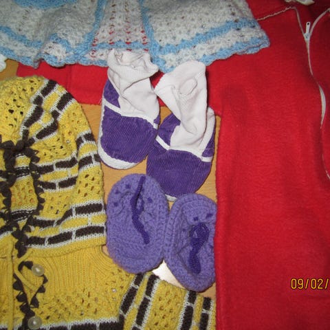 Har ligget i en plastikkasse med låg. Der kan være pletter på tøjet. 11 str. tøj for i alt 100 kr.