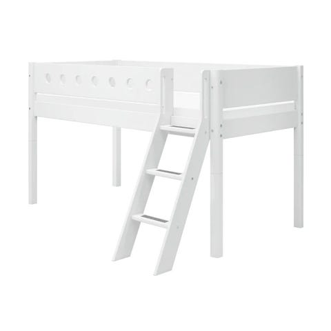 Flexa halvhøj seng i hvidt træ. Designet som en hævet seng med integreret stige og sikkerhedsrækværk. Egnet til børn og giver plads under sengen til opbevaring eller leg. Materialet er robust træ med en hvid finish.