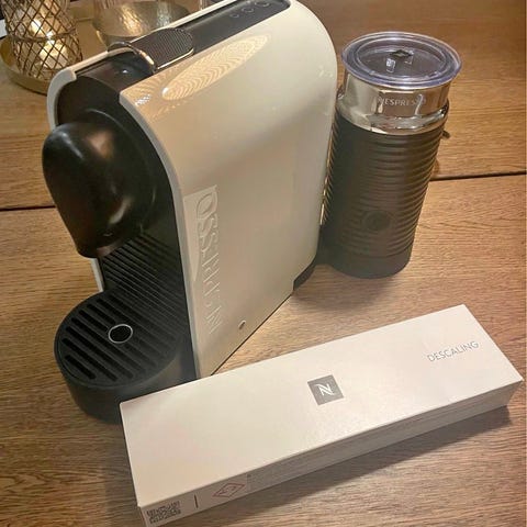 Nespresso Umilk kapselkaffemaskine i hvid farve. Maskinen har en integreret mælkeskummer og en aftagelig vandbeholder. Designet til brug med Nespresso kapsler og egnet til at lave forskellige kaffedrikke. Diverse kapsler (ca. 15) medfølger.