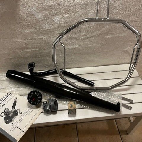 Det sidste billede er andre NOS dele de kan købes særskilt(skriv for priser): 17mm kaburator til 5,5 hk tunsæt / Udstødning og forrør til 5,5 hk tunsæt / Stempel til 5,5 hk tunsæt / Speedometer / Styrtbøjle.