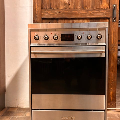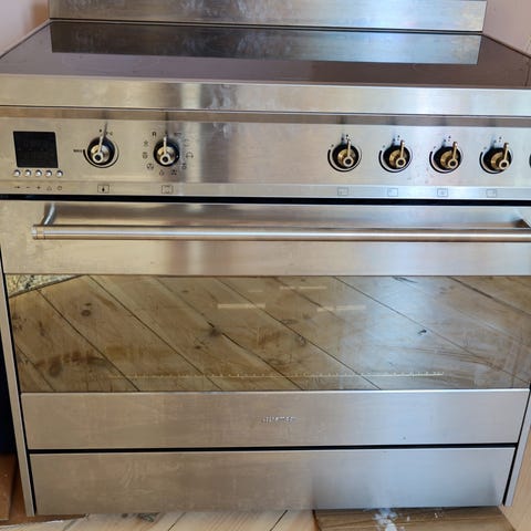 Smeg induktionskomfur med rustfrit stål finish. Komfuret har induktionskogeplader og flere betjeningsknapper på frontpanelet. Der er to ridser i glaspladen, samt almindelige brugs ridser.
