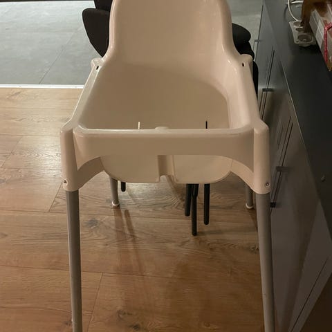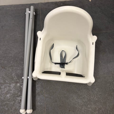IKEA højstol til børn med hvid plast sæde og grå metalben. Designet til at give støtte og komfort under måltider.