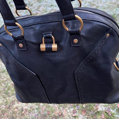 Vintage håndtaske i tidsløst design fra Yves Saint Laurent - YSL, med almindelige brugsspor. Foret er med YSL logo'er. Hardware -“Guld” farvet delvis aftaget. Højde ex. håndtag ca. 27 cm. Bredde forneden ca. 31 cm og foroven ca. 26 cm. Dybde i bund ca. 8 cm. Højde fra overkant af tasken til ”håndtag” udstrakt ca. 13 cm.