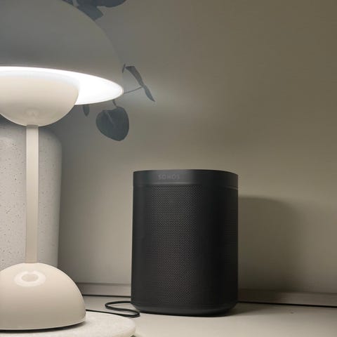 Sonos One trådløs højttaler i hvid farve. Kompakt design med touch-kontrol på toppen. Velegnet til trådløs musikafspilning i hjemmet. Strømforsyning via kabel. Model med indbygget mikrofon til stemmestyring.