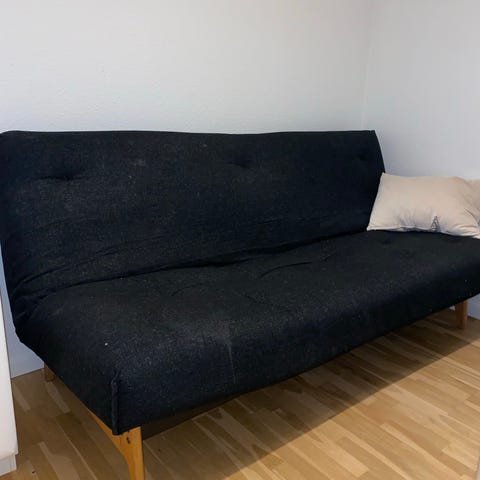 Sovesofa med lyseblåt stofbetræk. Ben i lakeret eg og matsort stel. Madrassen har en blød komfort og kan både bruges som hverdagsseng eller gæsteseng.