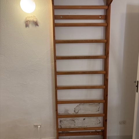 Træstige til vægmontering med tilhørende gymnastikringe og gynge. Fremstillet i træ med flere trin og snore til gymnastikringene. Velegnet til træning og leg i hjemmet. Anbefalet Max vægt 110 kg