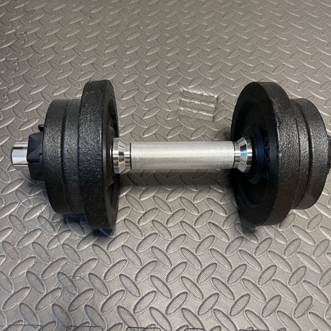 Justerbar håndvægt med sort og rød farve. Vægten kan tilpasses i størrelse ved hjælp af en skruefunktion. Materialet er plast og metal. Velegnet til styrketræning og fitnessøvelser.