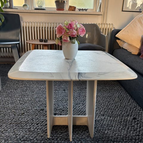 Bordet har almindelige, lette brugsspor, som er forventelige for et marmorbord af denne alder. Der er én mindre flig slået af i kanten (se billede), som er kosmetisk og ikke har betydning for funktion, stabilitet eller holdbarhed. Der er derudover ingen strukturelle skader, og bordet står solidt og stabilt.