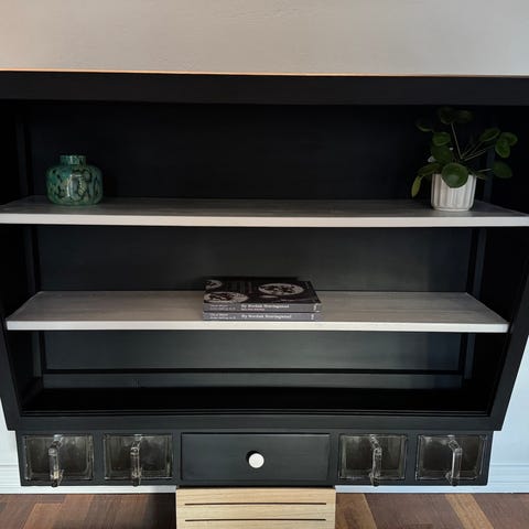 Fint nyrestaureret københavnerskab, der blevet monteret ny topplade, sat bagbeklædning på og hele møblet er blevet slebet og malet med kalkmaling i farven Black velvet og behandlet med sort voks efterfølgende, hylder er malet med hvid oliemaling.