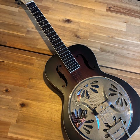 Jeg sælger denne Gretsch G9511 Style 1 Single-0 Parlor guitar. Super lækker lille guitar, top i massiv gran, ryg og sider af mahogni. Stor lyd trods relativt lille krop og meget velspillende. Gretsch fik aldrig lavet så mange af dem, da fabrikken brændte(!), så de er ikke så nemme at finde, men efter min mening et fund til prisen. Lyder langt bedre og mindre boxy end tilsvarende størrelse og pris. 44mm nut width. Nut og saddle af ben. 24.75" scale giver også rigtig god spilbarhed.
