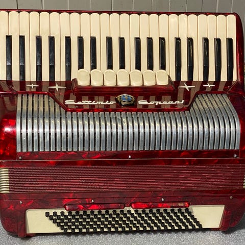 Ikonisk Settimio Soprani harmonika til salg. Fremstår i god stand, omend den har enkelte brugspor. Den kunne evt. bruge en lille finjustering, hvilket forklarer den lave pris.