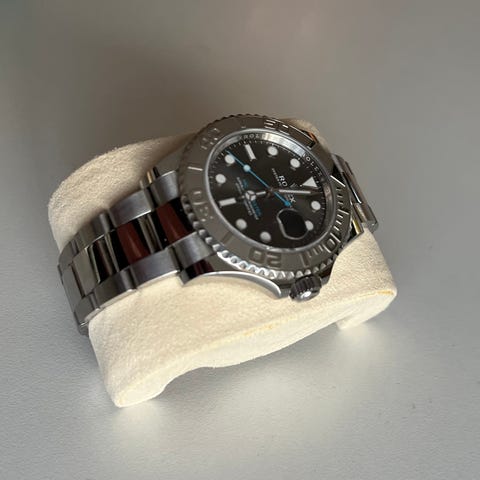 Smukt Yacht Master 116622 i Rolesium (stål med platin-bezel) med den ikoniske blå sunburst skive og rød sekundviser fra 2014, 40 mm Oyster-kasse, automatisk Cal. 3135, og Oyster-lænke. Uret fremstår elegant og sporty . Fuldt sæt med boks og certifikater. Befinder sig i Kbh K.