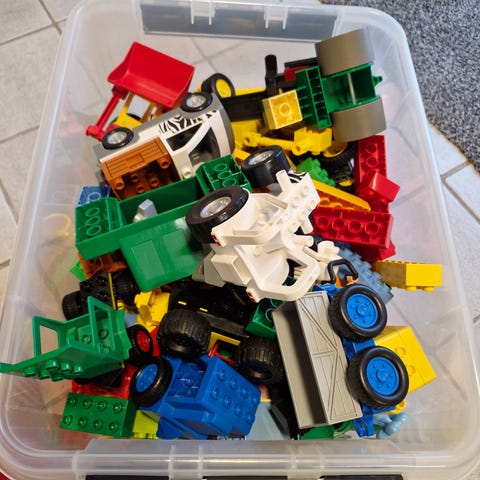 En hel kasse LEGO DUPLO byggeklodser i forskellige farver og former. Sættet indeholder klodser med hjul, tag, vinduer, Mickey mouse, traktor osv.. der kan bruges til at bygge forskellige strukturer og figurer. Egnet til børn og fremmer kreativ leg.