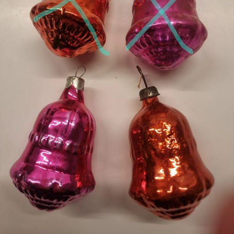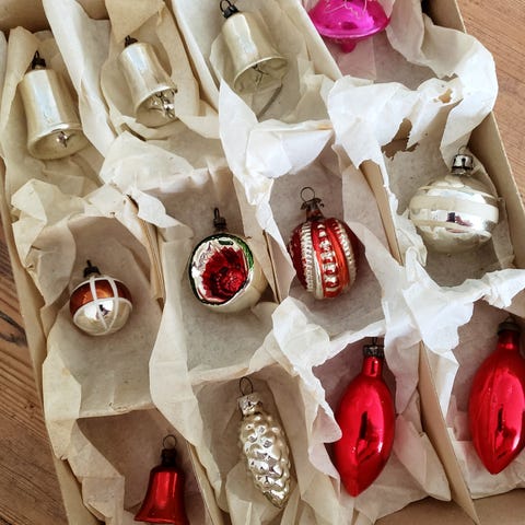 33 smukke ældre og nyere julekugler i forskellige størrelser og rød klokke.