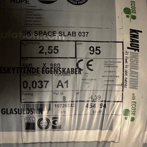 Knauf Insulation pakker isoleringsmateriale med en tykkelse på 45 mm, bredde på 460 mm og længde på 1250 mm.