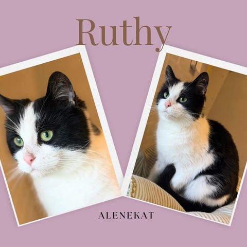 Ruthy er en smuk og blid tuxedo-hunkat på omkring 1 år, som er meget kontaktsøgende og elsker nus og menneskelig opmærksomhed. Hun er en rolig selskabskat, der trives med nærhed og gerne er en del af familiens hverdag. Hun er vant til børn og fungerer fint sammen med dem.